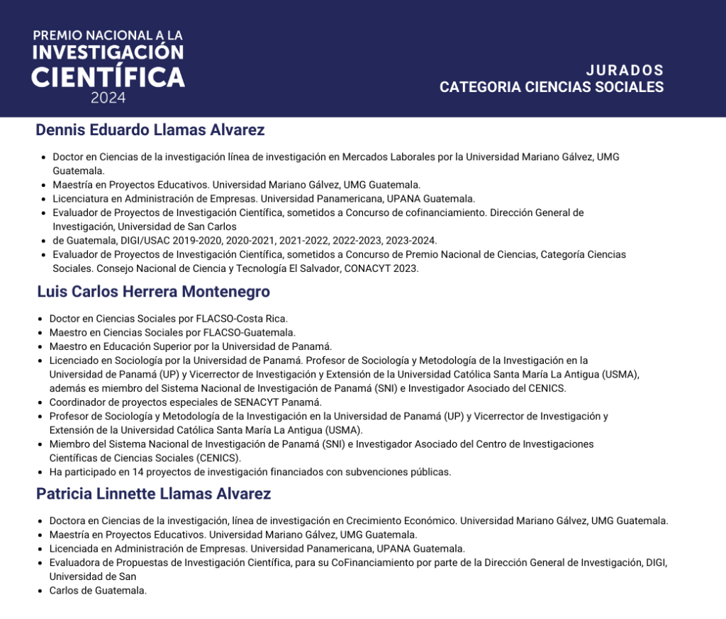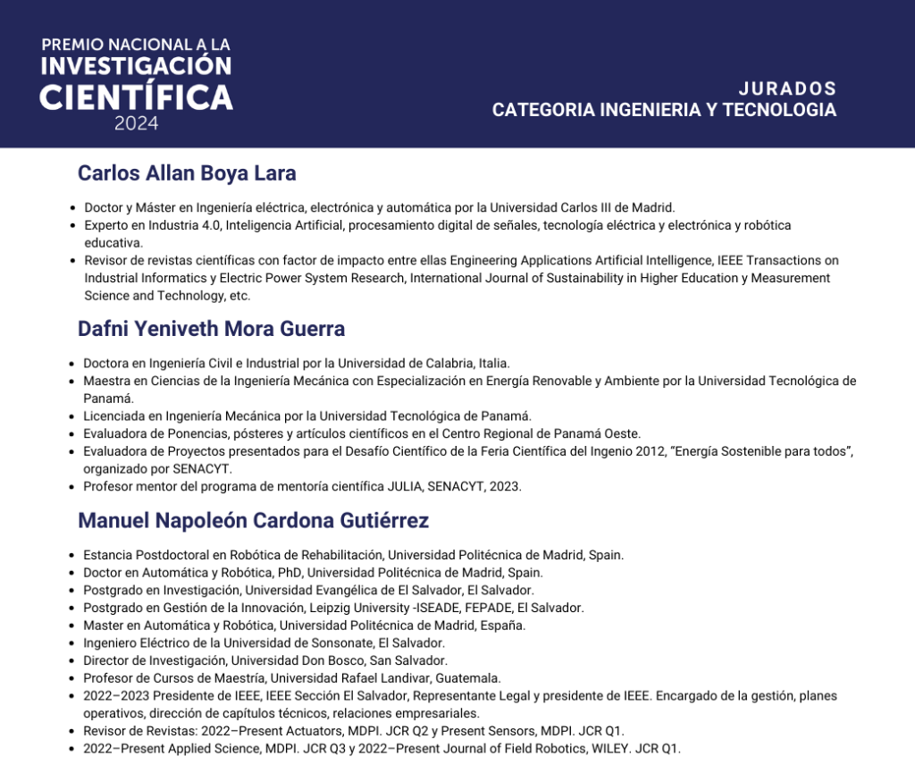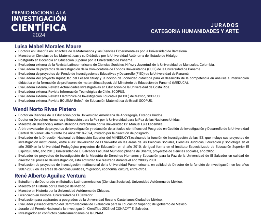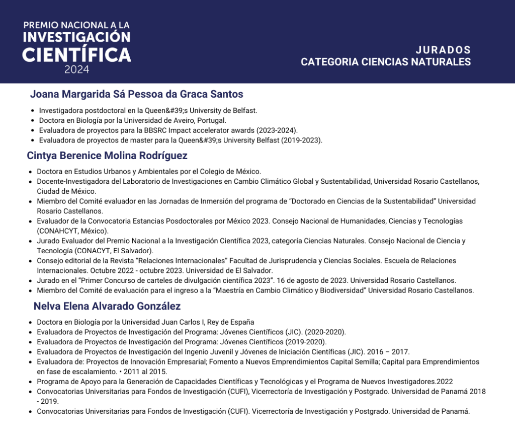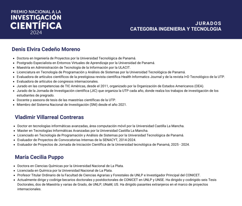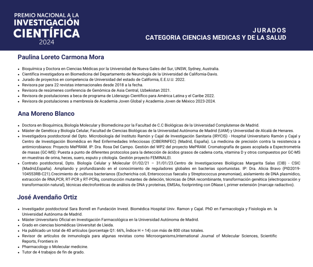 Nos complace presentar a los especialistas que formaron parte del jurado evaluador del Premio Nacional a la Investigación Científica 2024.